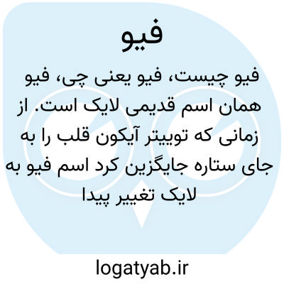 فیو همان اسم قدیمی لایک است. از زمانی که توییتر آیکون قلب را به جای ستاره جایگزین کرد اسم فیو به لایک تغییر پیدا کرد ولی اکثرا فعالان توییتری هنوز هم لایک را فیو میگویند و همچنین اصطلاح کامل آن کلمه فیوریت میباشد.