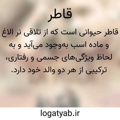 قاطر. [ طِ ] ( اِ ) قاتر. استر. بغل. ظاهراً این لفظ به تای فوقانی بوده و متأخرین به طاء بدل کرده اند. ( آنندراج ). حیوانی است قوی که تا پنجاه من بار حمل میکند، عموماً برای بارکشی ولی برای سواری هم تربیت مینمایند. بهترین جنس قاطرهای ایران در نواحی جنوبی و مخصوصاً در بروجرد زیاد میباشد. ( جغرافیای اقتصادی کیهان ص 209 ). حیوانی است که از اجتماع مادیان وخر نر تولید میشود، از خر بزرگتر و از اسب کوچکتر است. از جمله خصائل او یکی لجاجت و صبر کردن بر مشقات است و در جاهائی که گذشتن اسب از آنها دشوار است او به آسانی میگذرد. کوه نشینان به داشتن آن مایلند.