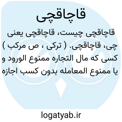 قاچاقچی. ( ترکی، ص مرکب ) کسی که مال التجاره ممنوع الورود و یا ممنوع المعامله بدون کسب اجازه ای از دولت و یا پرداختن گمرک وارد کند یا بفروشد. آنکه کالا از بیراهه گذراند.
