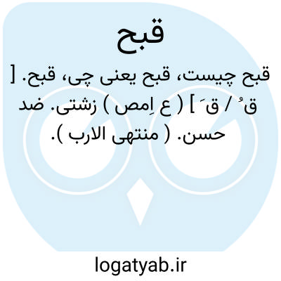 ( اسم ) ۱ - زشتی بدگلی بدشکلی مقابل حسن ۲ - بدی بدکاری ۳ - رسوایی یا قبح پیغمبری. گورگشاد و وسیع. یا قبح منظر. زشت رویی.
