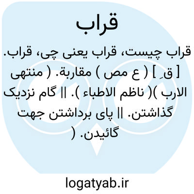 قراب. [ ق َ ] ( ع اِ ) نزدیک. ( منتهی الارب ) ( ناظم الاطباء ). گویند: افعل ذلک بقراب؛ ای بقرب. ( منتهی الارب )؛ یعنی بزودی بکن این را. ( ناظم الاطباء ).