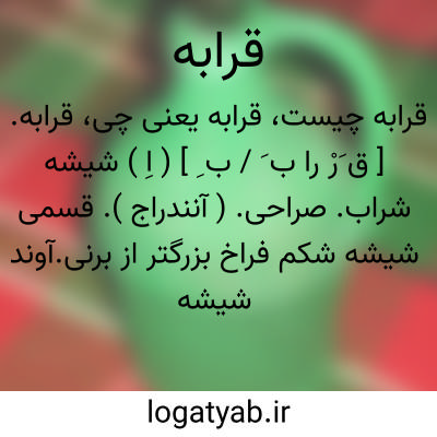 قرابه. [ ق َرْ را ب َ / ب ِ ] ( اِ ) شیشه شراب. صراحی. ( آنندراج ). قسمی شیشه شکم فراخ بزرگتر از برنی.آوند شیشه بزرگی که در آن شراب و جز آن ریزند. ( ناظم الاطباء ): بیامیزند و اندر این قرابه کنند، و سر قرابه استوار کنند. ( ذخیره خوارزمشاهی ).