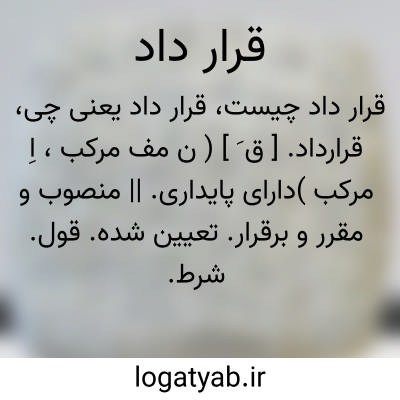 قرارداد. [ ق َ ] ( ن مف مرکب، اِ مرکب )دارای پایداری. || منصوب و مقرر و برقرار. تعیین شده. قول. شرط. پیمان. || اقرار. || دستور. || قانون. || ختم عمل. || قرارنامه. ( ناظم الاطباء ).