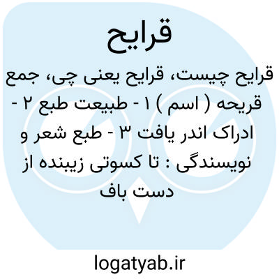 ( اسم ) ۱ - طبیعت طبع ۲ - ادراک اندر یافت ۳ - طبع شعر و نویسندگی: تا کسوتی زیبنده از دست باف قریحه خویش درو پوشم.جمع: قرایح ( قرائح ) قریحه خراشیدن. ( مصدر ) بقریحه خود فشار آوردن: متکلفی خاطر رنجانیده است و قریحت خراشیده.