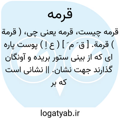 ( قرمة ) قرمة. [ ق َ م َ ] ( ع اِ ) پوست پاره ای که از بینی ستور بریده و آونگان گذارند جهت نشان. || نشانی است که بر تیر قمار نمایند مانند قرم شتر را. || جامه ای که بدان فرش را پاک کنند. ( اقرب الموارد ) ( منتهی الارب ).