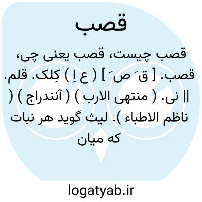 خرمن مه را چو قصب سوخته.نظامی. || ماشوره و هر چیز که مانند وی باشد میان کاواک چون استخوان و استخوان انگشت و نای. ( منتهی الارب ) ( اقرب الموارد ). || استخوانهای دو دست و پا و در هر انگشتی قصب است. || رگهای بال واستخوانهای آن. ( اقرب الموارد ). || رگهای گلو. || رگهای شُش و برآمدنگاه دَم. ( اقرب الموارد ) ( منتهی الارب ). || لوله. || کُزَل. کالی. شالی. || آب راهه های اشک و آب در چشم. ( منتهی الارب ). مجاری الماء من العیون. ( اقرب الموارد ). آب راهه از چشمه و چشمها. || مروارید تر آبدار و تازه. ( منتهی الارب ). دُرّ رطب. ( اقرب الموارد ). || زبرجد آبدار و تر مرصع به یاقوت. و به همین معنی است در این حدیث: بشر خدیجه ببیت فی الجنة من قصب. ( منتهی الارب ) ( اقرب الموارد ). || گوهر دراز. ( منتهی الارب ). ما کان مستطیلاً من الجوهر. ( اقرب الموارد ). || کتان تنک و نرم. واحد آن قصبی است. ( اقرب الموارد ) ( منتهی الارب ). || جامه ای است معروف. ( مهذب الاسماء ). جامه ابریشمین. جامه ای که از کتان و ابریشم بافند. ( غیاث اللغات ). و این معرب کسب است و آن جامه ای است که در هند مشهور است و نوعی است از بافتهای ابریشمی. ( غیاث اللغات ):