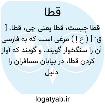 قطا. [ ق َ ] ( ع اِ ) مرغی است که به فارسی آن را سنگخوار گویند، و گویند که آواز کردن قطا، در بیابان مسافران را دلیل باشد بر اینکه در اینجا آب است. ( آنندراج ). || ج ِ قَطاة. ( اقرب الموارد ) ( منتهی الارب ). رجوع به قطاة شود. در مثل گویند: لیس قطاً مثل قُطَی ة؛ یعنی نیستند بزرگان مانند خردان. و نیز گویند: هو اهدی من القطا،و نیز گویند: هو اصدق من القطا. ذهبوا فی الارض بقطا؛ یعنی پراکنده شدند. ( اقرب الموارد ). || بیماریی است گوسفندان را. ( منتهی الارب ) ( آنندراج ).