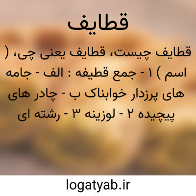 قطایف لایه ای خمیر نازک است که درون آن با خشکبار و پنیر پر شده که در روغن فراوان شناور شده و سرخ می شود و بر روی آن شربت شکر و گلاب و پودر پسته یا خلال بادام می ریزند.