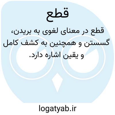 قطع. [ ق َ ] ( ع مص ) بریدن و جدا کردن. ( اقرب الموارد ) ( منتهی الارب ). گویند: قطعه قطعاً و مَقْطَعاً و تِقِطّاعاً. || گذشتن: قطع النهر قطعاً و قطوعاً؛ عَبَره. || به تازیانه زدن: قطع فلاناً بالقطیع. || چیره شدن: قطعه بالحجة؛ چیره شد بر وی به حجت. || ساکت کردن و خاموش ساختن. ( اقرب الموارد ) ( منتهی الارب ): قطع لسانه؛ به نیکوئی و احسان زبانش برید و خاموش ساخت. ( منتهی الارب ). || بریدن خویشی. ( اقرب الموارد ) ( منتهی الارب ): قطع رحمه قطعاً و قطیعة؛ برید خویشی را و گسست پیوند برادری را. || خفه شدن از کسی. ( منتهی الارب ). اختناق. ( اقرب الموارد ): قطع فلان الحبل، و منه قوله تعالی: ثم لیقطع ( قرآن 15/22 )؛ ای لیختنق. تاسه زده گردیدن: قُطِعَ فلان ( به طور مجهول )؛ تاسه زده گردید. ( منتهی الارب ). قطع النفس؛ انقطع. ( اقرب الموارد ). || نیمه حوض را پرکرده گذاشتن. ( اقرب الموارد ) ( منتهی الارب ): قطع الحوض قطعاً؛ ملأه الی نصفه ثم قطع عنه الماء. ( اقرب الموارد ). || فروختن ستور. ( اقرب الموارد ) ( منتهی الارب ): قطع عنق دابته؛ باعها. ( اقرب الموارد ). || افراز کردن. ( اقرب الموارد ). || بسنده شدن. ( منتهی الارب ): قطعنی الثوب؛ کفانی لتقطیعی. ( منتهی الارب ) ( اقرب الموارد ). || قُطِعَ الرجل؛ یئس او عجز. || منع کردن و بازداشتن: قطع فلاناً عن حقه؛ منعه. || جلوگیری کردن و ترساندن: قطع الطریق علی السالکین؛ منعه و اخافه. || باطل کردن: قطع الحدث الصلوة؛ ابطلها. || جزم کردن: قطع فلان فی القول؛ جزم. ( اقرب الموارد ) || ( اِمص ) جدائی. ( منتهی الارب ). جدائی بعض اجزاء جسم. ( اقرب الموارد ). و به فارسی با لفظ فرمودن و کردن و شدن مستعمل. ( آنندراج ). || ( اصطلاح عروض ) نزد عروضیان حذف آخر وتد مجموع واقع در عروض بیت است. و گویند زدن آن و ساکن گرداندن حرف متحرک ماقبل آن، مانند حذف نون مفاعلن و ساکن کردن لام آن تا متفاعل گردد. ( اقرب الموارد ). || ( اِ )برش و قالب و اندازه: کاغذی به قطع چهار ورق و نیم.کتاب به قطع وزیری. || ( اصطلاح هیأت ) در تداول منجمین احکامی و زایچه بینان و فال گیران، حادثه سوء که در زندگانی صاحب طالع روی خواهد داد. قران: و الصواب ان یدخل منا فی کل یوم علی الملک واحد، ویحکی له حکایة تمنعه عن قتله ذلک الیوم، فان کان علی الغلام قطع فیزول. ( سندبادنامه عربی چ اسلامبول ص 354 ). اصنعی له فیلاً من حلاوه و دعیه یأکله، یزول عنه القطع. ( همان کتاب ص 381 ). فظهر فی طالعه ان علیه قطع الی سبعة ایام و ان تکلم فیها کان حتفه فیها. ( همان کتاب ص 384 ). و کان علی قطع فدفع اﷲ عنی بهذه المراءة. ( همان کتاب ص 388 ). اما قواطع تنه نحوست وشعاعهاء ایشان آنک به کراهیت و دشمنی منسوبند و تنه کواکب ثابته آنک معروفند به قطع چون تسییر به ایشان رسد به وقتی کی عطیت بر نیمه بود یا به چهاریکها وتحویل تباه آید و آنجا سعدی را سعادت نبود که با منحست برابری کند، و از منجمان هست کی جایگاه سیک ها ( سه یک ها ) از عطیت به جای چهاریک ها دارند و قواطع بسیار است. ( التفهیم ص 521، 522 ). و در حاشیه التفهیم آرد:توضیح آنچه استاد ما فرمود این است که احکامیان میگویند تنه نحس یعنی جرم نحس خواه از ثوابت باشد از قبیل ثریا و دَبَران و خواه از سیارگان بود از قبیل مریخ و زحل و همچنین شعاع نحس یعنی تربیع و مقابله و همچنین حد و درجه نحس همگی از قواطعاند بدین سبب که در استخراج کمیت عمر دلیل باشند بر قطع عمر آنگاه که تسعیر بدانها رسد خاصه که معین مقوی از قبیل انتهأات و تحویلات در کار نباشد و عطیه عمر منحوس بود یانکبتی دهد نظیر قطع عمر. ( حاشیه التفهیم ص 522 ). || ( اصطلاح اصول فقه ) یکی از مباحث عقلی اصول فقه است که از دوره شیخ مرتضی به بعد بحث در آن رونق و اهمیت بیشتری پیدا کرد. شیخ در کتاب فرائد الاصول گوید: بدان مکلف هرگاه به حکم شرعی توجه پیدا کند یا برای وی نسبت به آن حکم قطع یعنی علم و یقین پیدا میشود یا ظن و یا شک، آنگاه هر یک از این سه قسم را مبداء و منشاء یک نوع ازاحکام شرعی قرار میدهد. قطع بر دو قسم است: قطع موضوعی و قطع طریقی. یک شی ممکن است به طور مستقیم موضوع حکم شرعی قرار گیرد