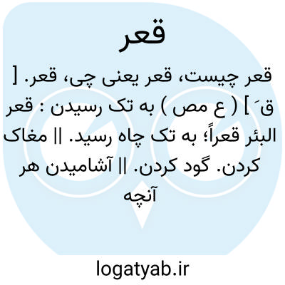 قعر. [ ق َ ] ( ع مص ) به تک رسیدن: قعر البئر قعراً؛ به تک چاه رسید. || مغاک کردن. گود کردن. || آشامیدن هر آنچه در کاسه باشد. ( اقرب الموارد ) ( منتهی الارب ): قعر الاناء؛ آشامید آنچه در آن بود. ( منتهی الارب ). || از تک خوردن. ( اقرب الموارد ) ( منتهی الارب ): قعر الثریدة؛ از تک اشکنه خورد. ( منتهی الارب ). || بر زمین افکندن. || از بیخ بریدن: قعر الجرة؛ قلعها من اصلها. || بچه ناتمام افکندن. ( اقرب الموارد ) ( منتهی الارب ).
