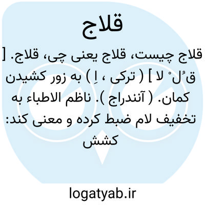 قلاج. [ ق ُل ْ لا ] ( ترکی، اِ ) به زور کشیدن کمان. ( آنندراج ). ناظم الاطباء به تخفیف لام ضبط کرده و معنی کند: کشش کمان به زور و قوت. ( ناظم الاطباء ). || مقدار درازی هر دو دست. ( آنندراج ):