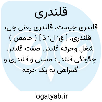 قلندری. [ ق َ ل َ دَ ] ( اِخ ) دهی است از دهستان گدارچین بخش هندیجان شهرستان خرم شهر، واقع در 40هزارگزی شمال خاوری هندیجان و یکهزارگزی اتومبیل رو بهبهان به هندیجان. موقع جغرافیایی آن دشت و هوای آن گرمسیری مالاریایی است. سکنه آن 120 تن است. آب آن از رودخانه زهره و محصول آن غلات و شغل اهالی زراعت و حشم داری است. راه در تابستان اتومبیل رو است. ساکنین از طایفه شریفات هستند. ( از فرهنگ جغرافیایی ایران ج 5 ).
