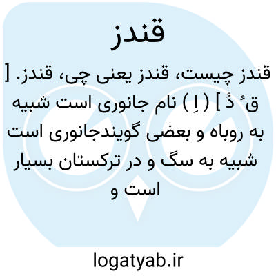 قندز. [ ق ُ دُ ] ( اِ ) نام جانوری است شبیه به روباه و بعضی گویندجانوری است شبیه به سگ و در ترکستان بسیار است و بعضی دیگر گویند سگ آبی است و آش بچه ها که جُند بیدسترباشد، خصیه اوست. ( برهان ). قندز = قندوز ترکی. ( فهرست مخزن الادویه ) قندس. ( فرهنگ دزی ). کندس = کندز ( تفس ). کاستر ( سگ آبی، کلب الماء - بیدستر ). ( دزی ج 2 ص 410 از حاشیه برهان چ معین ). || پوستی که سلاطین پوشند و کلاه نیز سازند گویند پوست همان جانور است. || یکی از نام های شراب. ( برهان ) ( آنندراج ). می و شراب. ( ناظم الاطباء ). || کنایه از شب تاریک چه قندز شب، سیاهی شب را گویند و هر گاه گویند «با قندز آرد»،مراد آن باشد که به شب آورد و شب شود همچنان که قاقم کنایه از روز است. ( برهان ) ( آنندراج ):