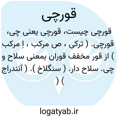 قورچی. ( ترکی، ص مرکب، اِ مرکب ) از قور مخفف قوران بمعنی سلاح و چی. سلاح دار. ( سنگلاخ ). ( آنندراج ) ( ناظم الاطباء ). رئیس جبه خانه. جبه پوش. ( ناظم الاطباء ). و در لغات ترکی قورچی بمعنی اهتمام کننده دربار پادشاه نوشته شده. ( آنندراج ). تلفظ صحیح آن ابتدا بایستی کرچی باشد که بمعنی تیرانداز ( با کمان ) است از ریشه کر «ترکش دار». ( سازمان اداری حکومت صفوی بنقل از مقدمه الادب پوپ چ لنینگراد 1938 م. ص 445 و دلاواله ص 766 تحت نام Corci ). قورچیان یعنی بازماندگان سواران عشیره ای و ایلیاتی سابق. آنان مانند مخازن اسلحه متحرک به کمان وتیر و شمشیر و خنجر و تبر و سپر مسلح بودند. کلاه اصلی این جنگجویان ترکمان که بهمان مناسبت نام قزلباش گرفته بودند کلاهی سرخ بود، دارای زرهی زنجیردار که بر گونه ها می افتاد. سبیل های بلند نیز از مشخصات قورچیان بود. ( سازمان اداری حکومت صفوی ): در همان روز قورچیان در عمارت پادشاهی وی را [ ابونصر طبیب ] با سوء احوال بقتل آوردند. ( نامه دانشوران ).