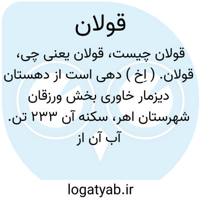 قولان. ( اِخ ) دهی است از دهستان دیزمار خاوری بخش ورزقان شهرستان اهر، سکنه آن 233 تن. آب آن از رودخانه قولان و محصول آن غلات، انجیر، انار، انگور و سردرختی. شغل اهالی زراعت،گله داری، کسب و صنایع دستی زنان آنجا جاجیم بافی است. راه مالرو دارد. ( از فرهنگ جغرافیایی ایران ج 4 ).