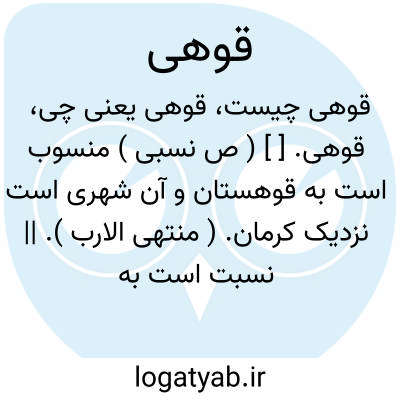 قوهی. [ ] ( ص نسبی ) منسوب است به قوهستان و آن شهری است نزدیک کرمان. ( منتهی الارب ). || نسبت است به قوهستان معرب کوهستان. ( المعرب جوالیقی ص 264 ). || ثوب قوهی؛ جامه ای است که در قهستان کرمان بافند یا هر جامه که به جامه قوهی ماند. ( منتهی الارب ) ( از اقرب الموارد ). نوعی از جامه های سپید. ( آنندراج ) ( از اقرب الموارد ) ( منتهی الارب ).