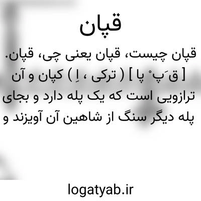 قپان. [ ق َپ ْ پا ] ( ترکی، اِ ) کپان و آن ترازویی است که یک پله دارد و بجای پله دیگر سنگ از شاهین آن آویزند و بلغت رومی قسطاس میگویند. ( برهان ).
