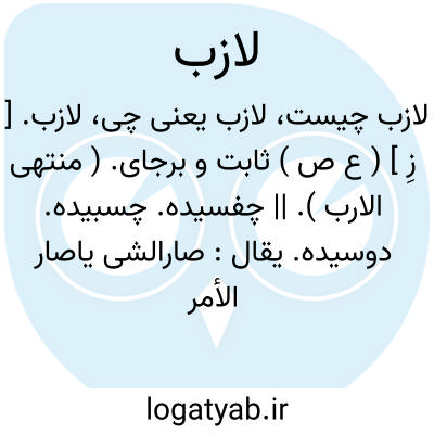 لازب. [ زِ ] ( ع ص ) ثابت و برجای. ( منتهی الارب ). || چفسیده. چسبیده. دوسیده. یقال: صارالشی یاصار الأمر ضربة لازب و هو افصح من لازم. ( منتهی الارب ). لازم. ( دهار ). دوسنده. چفسنده. چسبنده. لاصق. لاتب.