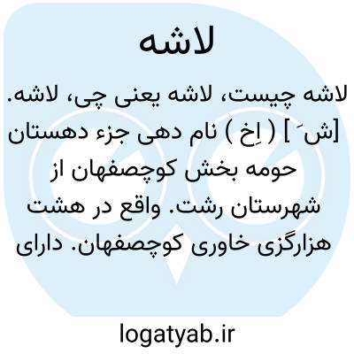 لاشه. [ش َ ] ( اِخ ) نام دهی جزء دهستان حومه بخش کوچصفهان از شهرستان رشت. واقع در هشت هزارگزی خاوری کوچصفهان. دارای 490 تن سکنه. ( فرهنگ جغرافیائی ایران ج 2 ).