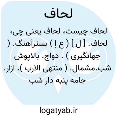 ( اسم ) ۱- بالاپوش پشمین یا پنبه یی که در هنگام خواب برروی خود اندازند بالاپوش شب دواج مقابل نهالی زیر پوش: نالنده اسقفی زبر بستر پلاس رومی لحاف زرد بپهنابر افکند. ( خاقانی. سج.۱۳۴ ) توضیح در تداول آنرا بفتح اول تلفظ کنند. یا دعوی سر لحاف ملانصرالدین است ( بود ). گویند هیاهوی نزاعی از کوچه شنیده میشد و چون هوا سرد بود ملانصرالدین لحاف را بخود پیچید و برای اطلاع از موضوع بیرون رفت. چند طرار لحاف را از دوش ملا ربودند و گریختند. ملا بخانه بازگشت. زن ازو پرسید: دعوی بر سرچه بود ? گفت: سر لحاف ما ( ملانصرالدین ) اینک ببردند و نزاع تمام شد. ۲- پوشش. ۳- برگستوان: لحافی بر افکند بر پشت بور در آمد بزین آن تن پیل زور. ( نظامی لغ. )