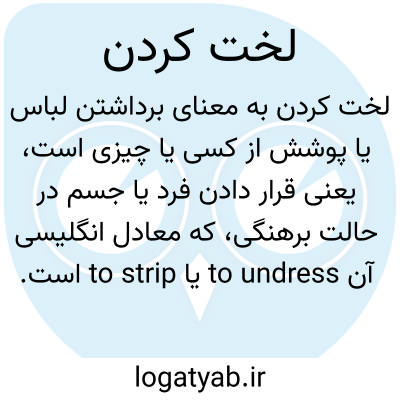 عبارت «لخت کردن» در فارسی به معنای برداشتن لباس یا پوشش از کسی یا چیزی است، یعنی قرار دادن فرد یا جسم در حالت برهنگی، که معادل انگلیسی آن to undress یا to strip است. عمل لخت کردن ممکن است در موقعیت‌های مختلف رخ دهد، مانند لباس درآوردن فرد در محیط خصوصی، معاینات پزشکی، یا آماده‌سازی برای حمام و استحمام. معنای دوم، استعاری و مجازی است و به مفهوم غارت کردن، چپاول کردن یا بردن دارایی دیگران اشاره دارد، همانند زمانی که گفته می‌شود کسی یک محل یا اموال دیگران را «لخت کرده». این کاربرد استعاری معمولاً در متون تاریخی، ادبی یا گزارش‌های خبری دیده می‌شود. به طور کلی، «لخت کردن» هم یک عمل فیزیکی است و هم یک مفهوم استعاری برای تصاحب یا غارت اموال دیگران.