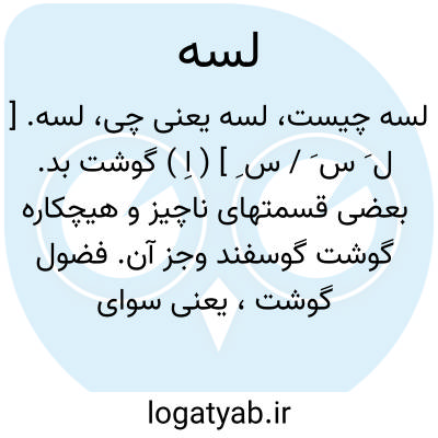 لسه. [ ل َ س َ / س ِ ] ( اِ ) گوشت بد. بعضی قسمتهای ناچیز و هیچکاره گوشت گوسفند وجز آن. فضول گوشت، یعنی سوای گوشت لخم و استخوان. گوشت کم با پوست و پیه دوسیده. پوست درونی گوشت گوسفند و گاو و امثال آن که به چربو و پیه پیوسته باشد.