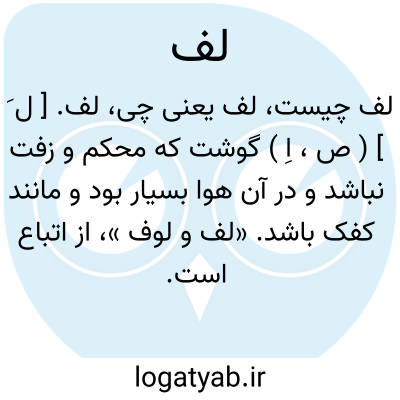 لف. [ ل َ ] ( ص، اِ ) گوشت که محکم و زفت نباشد و در آن هوا بسیار بود و مانند کفک باشد. «لف و لوف »، از اتباع است. «لف و کف » نیز گویند.
