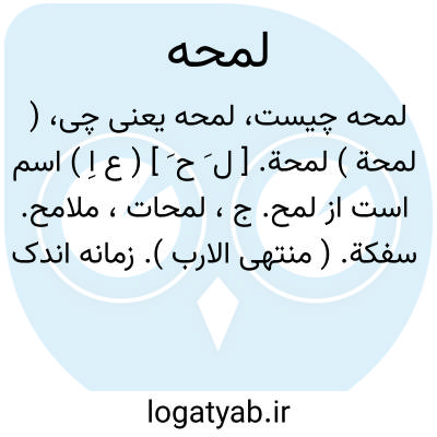 ( لمحة ) لمحة. [ ل َ ح َ ] ( ع اِ ) اسم است از لمح. ج، لمحات، ملامح. سفکة. ( منتهی الارب ). زمانه اندک که به مقدار قلیل باشد. ( غیاث ). چشم زد: دیگر خصلت از خصال حمیده و خصائص پسندیده اوست که یک لمحة البصر از عمر او... ضایع نماند. ( ترجمه تاریخ یمینی ص 21 ). چون لمحه لحظه فراغی یابد به مطالعه کتب و مجالست فضلا و مؤانست حکما... استیناس جوید. ( ترجمه تاریخ یمینی ). || دزدیدگی نگاه و پنهان دیدگی. || دیدن در چیزی. یک بار اندک دیدن چیزی را. || درخش.( منتهی الارب ). درخشیدن برق. || شبه و مانند. یقال: فیه لمحة من ابیه. || خوبی. || حُسن ِ روی که آشکار گردد. ( منتهی الارب ).