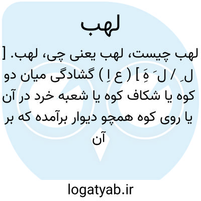 لهب. [ ل ِ / ل َ هَِ ] ( ع اِ ) گشادگی میان دو کوه یا شکاف کوه یا شعبه خرد در آن یا روی کوه همچو دیوار برآمده که بر آن برآمدن نتوانند. ج، الهاب، لهوب، لهاب، لهابة. || ( اِخ ) قبیله ای است از ازد. ( منتهی الارب ).