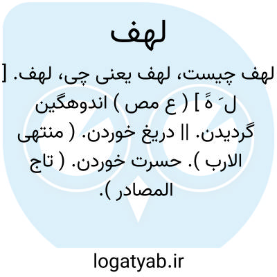 ( اسم ) ۱- حسرت. ۲- حزن اندوه: او سگ فرخ رخ کهف من است بلکه او هم درد و هم لهف من است ( مثنوی لغ. )