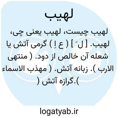 لهیب. [ ل َ ] ( ع اِ ) گرمی آتش یا شعله آن خالص از دود. ( منتهی الارب ). زبانه آتش. ( مهذب الاسماء ).گرازه آتش ( در تداول مردم قزوین ). آتش شعله زن. ( غیاث ). زبانه زدن آتش. افروختن آتش. لَهب: