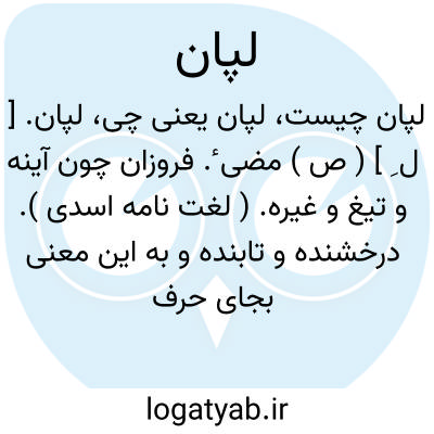 لپان. [ ل ِ ] ( ص ) مضی ٔ. فروزان چون آینه و تیغ و غیره. ( لغت نامه اسدی ). درخشنده و تابنده و به این معنی بجای حرف ثانی با «ی » حطی هم آمده است یعنی لیان. ( برهان ). و شعر ذیل فرخی را بعض لغت نامه ها برای لیان بشاهد آورده اند: