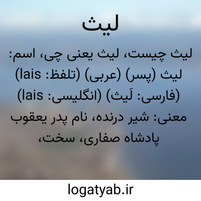 معنی: شیر درنده، نام پدر یعقوب پادشاه صفاری، سخت، شدید، شیر، اسد، ( به مجاز ) دلیر و شجاع، ( اَعلام ) ) لَیث ابن بختری مرادی [قرن هجری] از یاران امام باقر ( ع ) و امام صادق ( ع ) که کنیه او ابوبصیر بوده است، ) چهارمین امیر [، قمری] سلسله ی صفاریان، فارس را تصرف کرد ولی از سپاهیان خلیفه شکست خورد و اسیر شد و او را در بغداد کشتند، ( در اعلام ) نام یکی از یاران امام باقر ( ع ) و امام صادق ( ع ) که کنیه او ابوبصیر بوده است