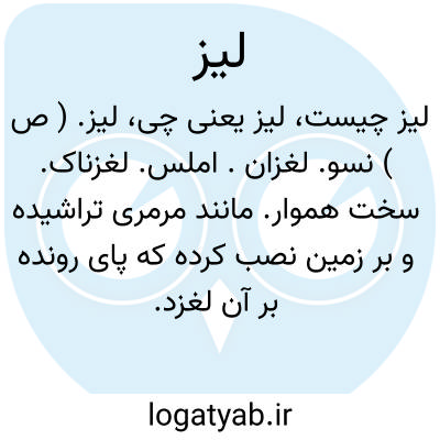 لیز. ( ص ) نسو. لغزان. املس. لغزناک. سخت هموار. مانند مرمری تراشیده و بر زمین نصب کرده که پای رونده بر آن لغزد. لغزاننده، چنانکه زمین یخ بسته. لغزنده و نرم را گویند و هر چیز که با او لغزندگی و نرمی باشد. ( برهان ). لغزنده: معده لیز و آب هندوانه.
