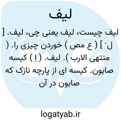 لیف. ( اِ ) کیسه صابون. کیسه ای از پارچه نازک که صابون در آن نهند و تن شویند با آن. کیسه ای از ململ یا چلوار و امثال آن که صابون در آن نهاده و بدن را بدان شویند. هر کیسه از چلوار و مانند آن را گویند که در حمام به صابون آلایند و بردن شوخ را بر تن مالند. || قسمی کدو که چون خشک شود گوشت آن فروریزد و الیاف آن چون کیسه ای برجای ماند وبا آن در حمام چرک تن گیرند. قسمی کدو یا الیاف دیگر که بدان در حمام شوخ از تن سترند. قسمی کدو که چون خشک شود و گوشت آن به مالیدن فروریزد الیاف درهم پیوسته آن چون کیسه ای شود که در حمام بجای کیسه به کاربرند. قسمی کدو که چون بخشکد آن را به دست بمالند تا فضول آن بریزد و از زیر آن کیسه مانندی از الیاف بهم تافته پیدا آید و آن را بجای کیسه پشمین در حمام هابه کار برند. ج، الیاف. || طوری. || در لوترا، ریش را لیف گویند. ( حاشیه فرهنگ اسدی نخجوانی ):