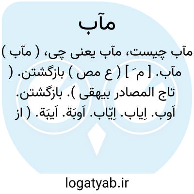 ۱- ( اسم ) بازگشت. ۲- ( اسم ) جای بارگشت جمع: ماوب: شعرا را در گاه او ماب شده و بخت بدار باب فضل در حضرت او در خواب گشته.