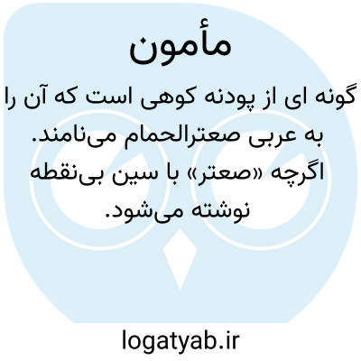 مامون. ( اِ ) نوعی از پودنه کوهی باشد و آن را به عربی صعترالحمام خوانند، و صعتراگرچه با سین بی نقطه است لیکن در کتب طبی به صاد نوشته اند تا به شعیر مشتبه نشود. خوردن آن در طعام ضعف چشم را نافع باشد و قوت باصره را نگاه دارد. ( برهان ). نوعی از پودنه کوهی که به تازی صعترالحمام گویند. ( ناظم الاطباء ). مرزنگوش وحشی را گویند که به نام فودنج جبلی و پودنه کوهی و صعترالحمام نیز موسوم است. ( فرهنگ فارسی معین ). حاشا است. ( فهرست مخزن الادویه ). و رجوع به حاشا شود.