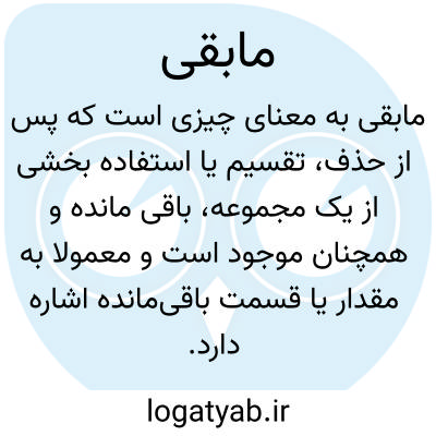 مابقی به معنای چیزی است که پس از حذف، تقسیم یا استفاده بخشی از یک مجموعه، باقی مانده و همچنان موجود است و معمولاً به مقدار یا قسمت باقی‌مانده اشاره دارد. این واژه نشان‌دهنده بخش غیرمصرف‌شده، باقی‌مانده یا کم‌اهمیت‌تر نسبت به کل است و در زندگی روزمره، ریاضیات، حسابداری و مباحث اداری کاربرد فراوان دارد. مابقی می‌تواند شامل پول، زمان، مواد، کالا یا هر چیز قابل شمارش یا تقسیم باشد که بعد از انجام عمل مشخصی از کل مجموعه باقی می‌ماند. در محاوره و نوشتار، این واژه اغلب برای اشاره به چیزی که باید توجه شود یا مورد استفاده بعدی قرار گیرد به کار می‌رود و مفهوم نظم و حسابرسی را منتقل می‌کند. در ریاضیات، مابقی نقش مهمی در عملیات تقسیم و تعیین سهم‌ها دارد و به عنوان یک بخش تعیین‌کننده در تحلیل داده‌ها یا حل مسائل کاربرد دارد. این واژه همچنین در اسناد و قراردادها برای مشخص کردن بخش باقی‌مانده از مبلغ، کالا یا وظایف تعریف می‌شود و شفافیت و دقت را تضمین می‌کند. این واژه بیانگر ضرورت توجه به آنچه پس از عمل یا تخصیص باقی می‌ماند و اهمیت مدیریت منابع و کنترل مصرف است. در زبان ادبی، مابقی می‌تواند به صورت استعاری برای بیان باقی‌مانده احساسات، خاطرات یا آثار گذشته نیز به کار رود.