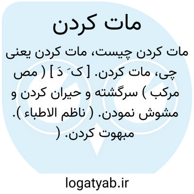 ( شطرنج ) مغلوب کردن شاه شطرنج. توضیح هدف از بازی شطرنج مات کردن حریف است. هرگاه بشاه سفید یا سیاه کیش داده شود و دفع کیش بایک حرکت ممکن نگردد شاه مات میشود و بازی ختم میگردد.