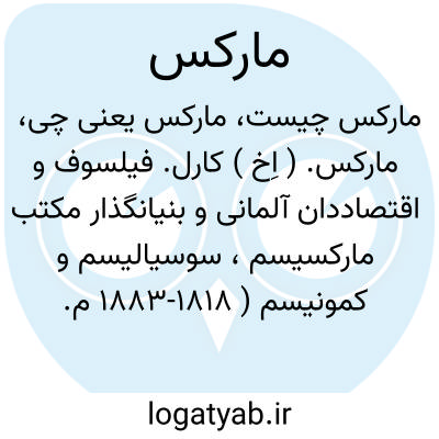 مارکس. ( اِخ ) کارل. فیلسوف و اقتصاددان آلمانی و بنیانگذار مکتب مارکسیسم، سوسیالیسم و کمونیسم ( 1818-1883 م. ) وی فرزند مردی یهودی بود و پس از پایان تحصیل در دانشگاه شهر بُن نخست به روزنامه نگاری پرداخت سپس به مطالعه فلسفه و اقتصاد سرگرم شد و افکار و عقاید تازه خود را انتشار داد. مارکس سه مبنای کمونیسم یعنی فلسفه ماتریالیسم دیالکتیک، اقتصاد و جامعه شناسی را مدون ساخت و بر اثر مطالعه در تاریخ تحول جامعه ها، اجتماعات بشری را به پنج دوره: اجتماع اشتراکی اولیه، بردگی، فئودالیته، سرمایه داری و سوسیالیسم تقسیم کرد. ( از فرهنگ فارسی معین ).