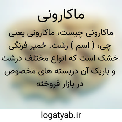 ( اسم ) رشت. خمیر فرنگی خشک است که انواع مختلف درشت و باریک آن دربسته های مخصوص در بازار فروخته میشود. برای طبخ آن ماکارنی را ببلندی انگشت خرد کرده در آب جوش باقدری نمک مانند برنج طبخ کنند. آنرا باید گاهی با کفگیر بیرون آورد و دست زد تا ببینند پخته شده یا نه ولی زیاد نباید پخته شود. همینکه لول. خمیر سفید و درشت شد وبفشاردست نرم گردید پخته است. آنگاه در چلو صافی ریزند تا آبش گرفته شود.سیس یک سیر روغن داغ داخل دیگ کنند و کمی هم آب گرم ریزند و ماکارنی راهم در آن ریخته سرش را میگذارند و تا چند دقیقه دم کنند. بعد پنیر فرنگی یا پنیر خیکی را خرد کرده کمی از آن را در ظرف مخصوصی می پاشند و قدری ماکارنی را در آن ظرف کشیده و کمی پنیر دیگر روی آن بپاشند و اندکی سس دهند و هنچنین یک طبقه پنیر و کمی سس و طبق. دیگر ماکارنی ریزند تاماکارنیها تمام شود. در آخر ژیگویا کباب روی ماکارنی ریزند و سر سفره برند. توضیح ماکارنی انواع مختلف دارد مانند: ماکارنی سرخ کرده ماکارنی کوکو و غیره.