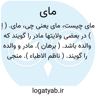 مای. ( اِ ) در بعضی ولایتها مادر را گویند که والده باشد. ( برهان ). مادر و والده را گویند. ( ناظم الاطباء ). منجی، «مایا» ( مادر ). گبری، «مایه » ( مادر ). ( حاشیه برهان چ معین ). || ( فعل نهی ) مخفف میای باشد که منع از آمدن است. ( برهان ) ( از انجمن آرا ). کلمه فعل یعنی میا که نهی از آمدن باشد. ( ناظم الاطباء ):
