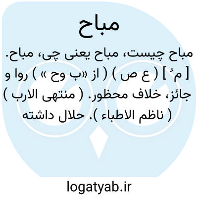 مباح. [ م ُ ] ( ع ص ) ( از «ب وح » ) روا و جائز، خلاف محظور. ( منتهی الارب ) ( ناظم الاطباء ). حلال داشته شده و جایز داشته شده. ( غیاث ). مباحات جمع آن. ( آنندراج ). حلال کرده شده. مجاز و شایان و... مشروع. ( از ناظم الاطباء ). حلال داشته شده. جایز دانسته. روا. حِل. حلال. ( یادداشت به خط مرحوم دهخدا ):