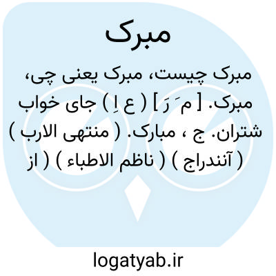 مبرک. [ م َ رَ ] ( ع اِ ) جای خواب شتران. ج، مبارک. ( منتهی الارب ) ( آنندراج ) ( ناظم الاطباء ) ( از اقرب الموارد ). معطن. مناخ. ( یادداشت به خط مرحوم دهخدا ). یقال: «فلان لیس له ُ مبرک جمل »؛ ای لاشی له. ( اقرب الموارد ). || نشستنگاه. ج، مبارک. ( یادداشت به خط مرحوم دهخدا ).