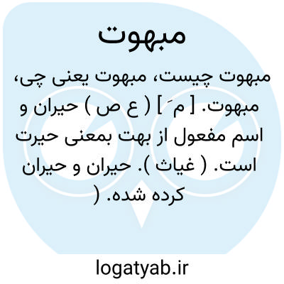 مبهوت. [ م َ ] ( ع ص ) حیران و اسم مفعول از بهت بمعنی حیرت است. ( غیاث ). حیران و حیران کرده شده. ( آنندراج ). عاجز شده و متحیر مانده. ( ازمنتهی الارب ). سرگشته و متحیر. ( محیطالمحیط ). متحیر.( بحرالجواهر ). عاجز و متحیر و پریشان و سرگشته و حیران و سرگردان و پریشان و آشفته و متعجب. ( ناظم الاطباء ). || افترا زده شده و دروغ بربسته شده.( ناظم الاطباء ). || مأخوذ ازتازی سرگشته و حیران و سرگردان و پریشان و آشفته و متعجب و گنگ وبی زبان و ساکت و خاموش از آشفتگی. ( ناظم الاطباء ).