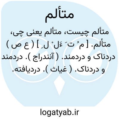 متألم. [ م ُ ت َ ءَل ْ ل ِ ] ( ع ص ) دردناک و دردمند. ( آنندراج ). دردمند و دردناک. ( غیاث ). دردیافته. ( ناظم الاطباء ). مأخوذ از تازی، غمناک و دردمند و آزرده و رنج کشیده و متأذی و اندوهگین و رنجیده و ناخشنود. ( ناظم الاطباء ). و رجوع به تألم شود.