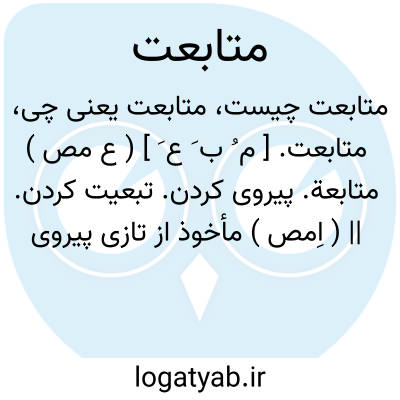 ۱ - ( مصدر ) پیروی کردن تبعیت کردن. ۲ - ( اسم ) پیروی: متابعت ایشان واجب و لازم دانستی. ۳ - عبارتست از آنکه راوی معینی با غیر خود موافق باشد در تمام سند ( اسناد ) یعنی دو راوی در یک روایت در اسناد مانند هم باشند در تمام مراتب که متابعت تامه است یا در بعضی که ناقصه است.