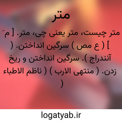 متر. [ م َ ] ( ع مص ) سرگین انداختن. ( آنندراج ). سرگین انداختن و ریخ زدن. ( منتهی الارب ) ( ناظم الاطباء ) ( از اقرب الموارد ). || بریدن. ( منتهی الارب ) ( آنندراج ) ( تاج المصادر ) ( ازاقرب الموارد ) ( ناظم الاطباء ). || دراز کشیدن رسن و مانند آن. ( منتهی الارب ) ( آنندراج ) ( از اقرب الموارد ). کشیدن. ( تاج المصادر ). کشیدن ریسمان و مانند آن را. ( ناظم الاطباء )؛ متر الحبل و نحوه. ( از اقرب الموارد ) ( از ناظم الاطباء ). || گائیدن. ( منتهی الارب ) ( آنندراج ). جماع کردن با زن خود. ( ناظم الاطباء )؛ متر المراءة؛ نکحها. ( از ذیل اقرب الموارد ). متر امرأته؛ جماع کرد با زن خود. ( ناظم الاطباء ). || انداختن. ( منتهی الارب ) ( آنندراج ).