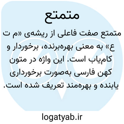 (مُ تَ مَ تِّ ) [ ع. ] (اِفا. ) ۱ - برخوردار از چیزی، بهره مند. ۲ - کسی که عمره (زیارت بیت الله با شرایط خاص ) به جا آورد.
