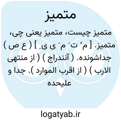 متمیز. [ م ُ ت َ م َ ی ی ِ ] ( ع ص ) جداشونده. ( آنندراج ) ( از منتهی الارب ) ( از اقرب الموارد ). جدا و علیحده و از هم جدا و متفاوت. ( ناظم الاطباء ).